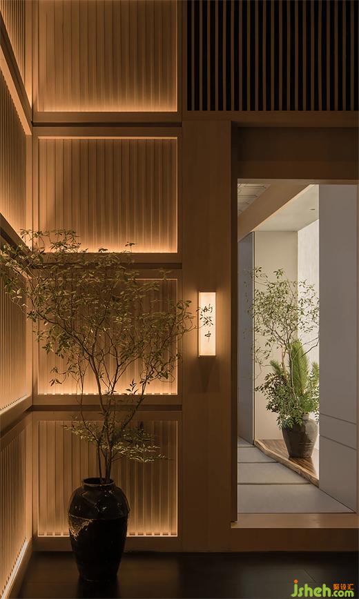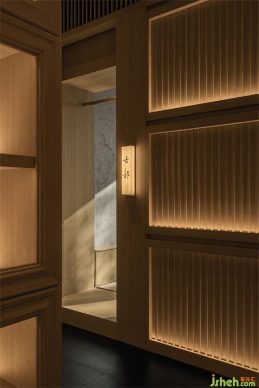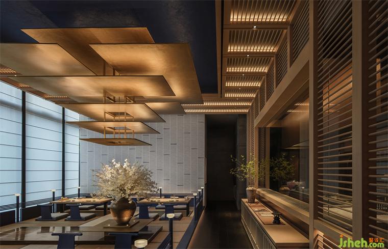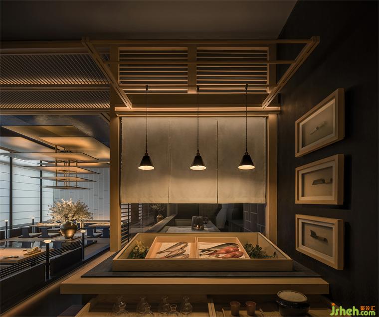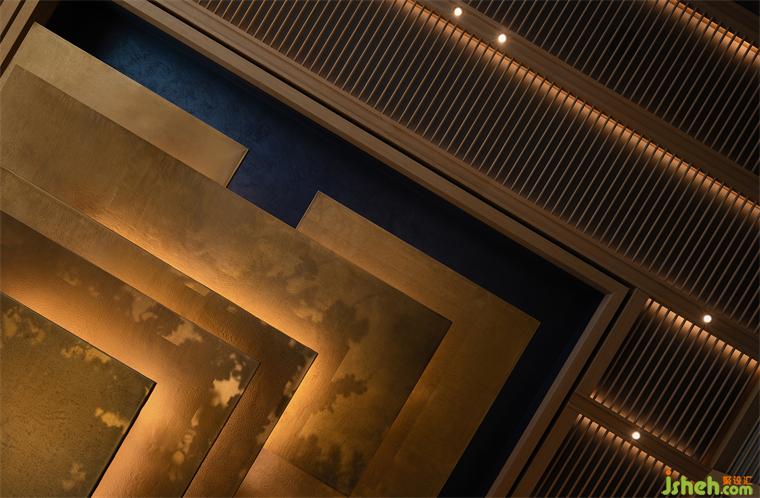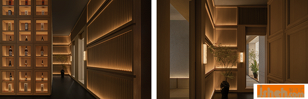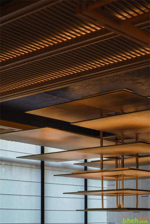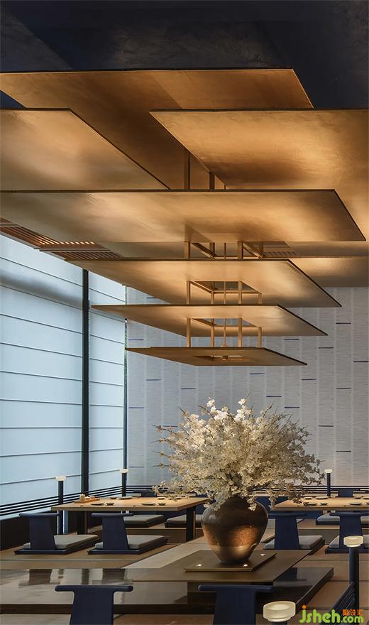 食客穿行至開(kāi)闊的大堂之處,從天花上懸掛下來(lái)的金色裝置映入眼簾,仿佛如初見(jiàn)水中倒映的金閣寺一般。裝置來(lái)自京都傳統(tǒng)的鍛金工藝精心制作而成,自然的紋理賦予了其古樸的質(zhì)地,又非一味的文化符號(hào)挪用,僅以簡(jiǎn)約的線(xiàn)條抽象描摹,強(qiáng)調(diào)出現(xiàn)代性的輪廓感,寥寥數(shù)筆就將這靜謐與遁世離俗的氣質(zhì)渲染,仿佛有來(lái)自原野的風(fēng)、搖曳的枝葉和濕潤(rùn)苔蘚的氣息都剎那間涌了進(jìn)來(lái)。