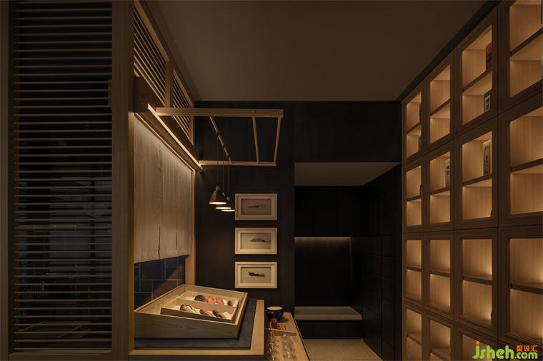而在與大堂平行并置的另一端明廚空間內(nèi),可近距離欣賞廚師炙烤鰻魚(yú)和端爐燒的烹飪過(guò)程,與大堂空間中懸掛的藝術(shù)裝置形成了有趣的互文關(guān)系——匠人們以火為主要方式淬煉出頂級(jí)料理的口感,與浴火再生的金閣寺復(fù)現(xiàn)之美,此時(shí)此地,發(fā)生碰撞,對(duì)話(huà),并盤(pán)旋上升,最終得以在整個(gè)空間回蕩。