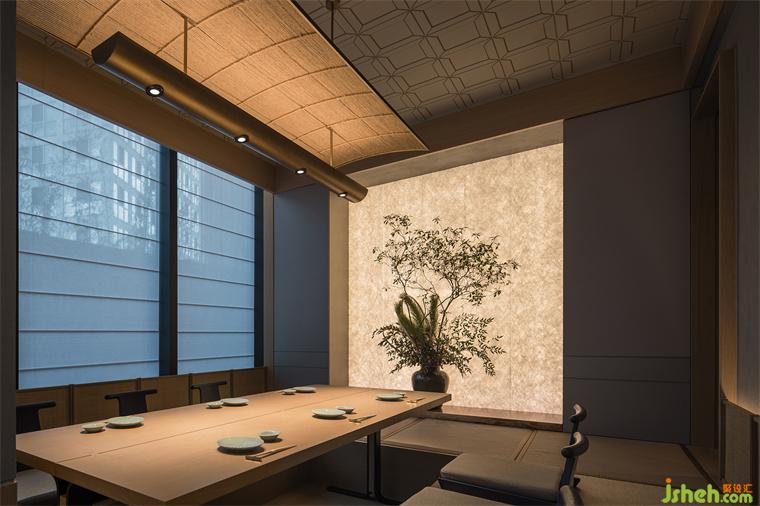 空間中還有很多與“紙”相關(guān)的元素讓立面有了生機(jī)和呼吸感。大廳中設(shè)計(jì)師基于對傳統(tǒng)和風(fēng)紋飾的吸收而原創(chuàng)的壁紙也恰到好處的為整體氛圍鋪陳。包廂中透光的杜邦紙搭配前方的植物,更有如山本梅逸的純墨色卷軸畫一般的風(fēng)骨。一窗之隔的室外是車水馬龍,室內(nèi)幽篁疏影,在方寸之間就能有了自然轉(zhuǎn)換的遠(yuǎn)近空間與細(xì)膩有致的層次布局。