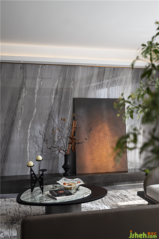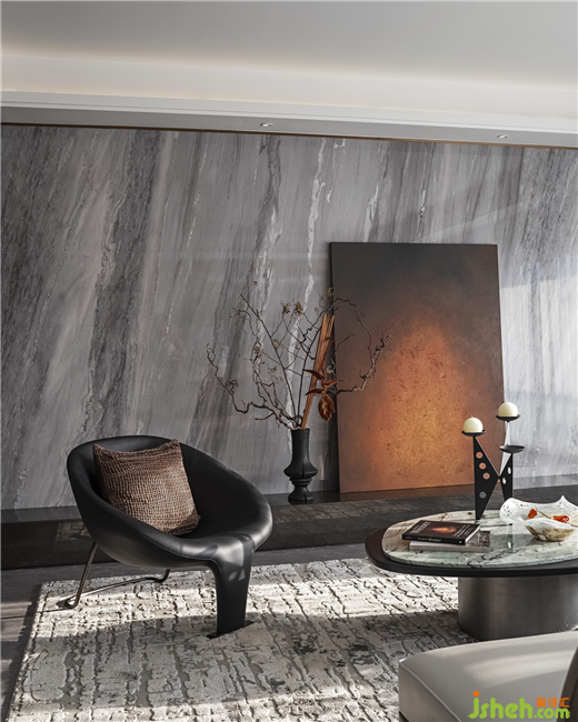 巖板背景墻保留材質(zhì)的原始質(zhì)感,使其更加富有生命力,與沉靜克制的木飾面在空間中碰撞,形成均衡的視覺關(guān)系。