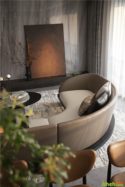 流線型的沙發(fā)座椅、肌理紋手工地毯以及搭配金屬石材茶幾,圍合出舒適通透的交流場域,也詮釋自然與巧工的和諧并存,使敘事空間更加生動。