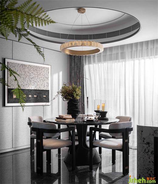 餐廳,一個可以回味的互動空間。廚房與餐廳保持了最大限度的交融與連續(xù),樣板房設計以「圓」爲主基調,圓桌有凝聚之意,與藝術圓環(huán)吊燈、弧形天花交相呼應,錯落有致,輕盈高闊,寄托人和美滿的美好期盼。