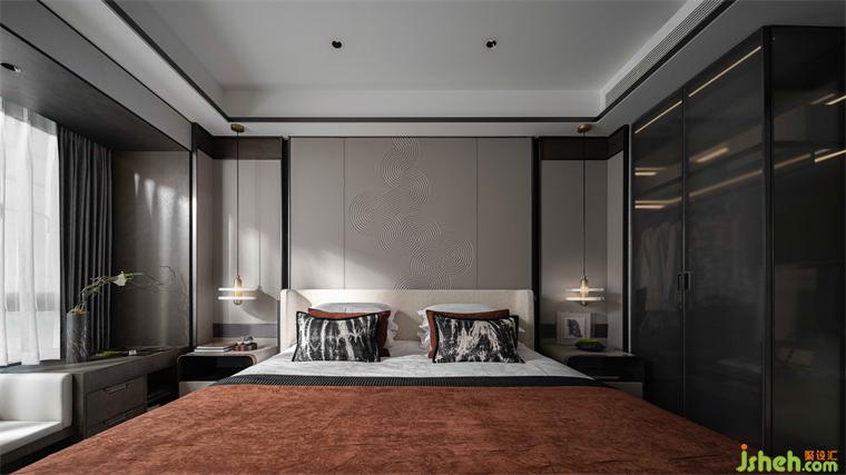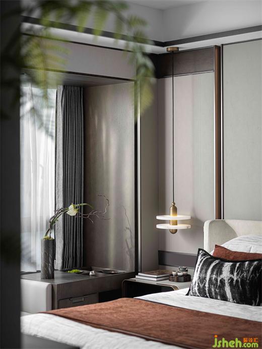 主臥空間優(yōu)雅淡然,皮革、木質(zhì)、金屬、石器在空間內(nèi)互相碰撞,增強(qiáng)室內(nèi)的呼吸感,賦予空間靈動的節(jié)奏。
