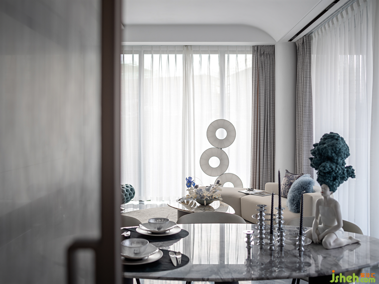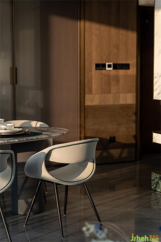 餐廳區(qū)域的設(shè)計(jì)描繪了日常生活的情感化與儀式感,曲線與直線的結(jié)合運(yùn)用,呈現(xiàn)出回轉(zhuǎn)靈動(dòng)的餐廳空間。在晨起暮落、柴米油鹽的熏染中,感受人間煙火的交織……