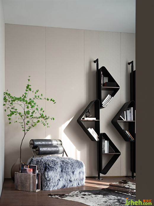 影音室,一處放松身心的精神角落。除去冗雜的裝飾,純樸簡(jiǎn)約的主色調(diào),弧形沙發(fā)和異形書本陳列架,在生活的張弛間從容有度。