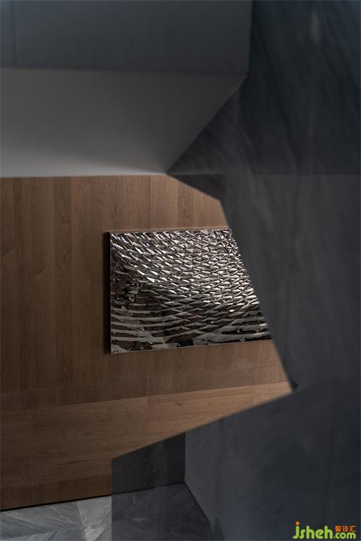 樓梯間藝術(shù)裝置的設(shè)計(jì)基于抽象的藝術(shù)暢想,獨(dú)特的波浪肌理在層層疊疊的起伏間,將繁復(fù)與簡(jiǎn)約平衡至極致,在光的折射下,彌漫著自然的神秘氣氛。