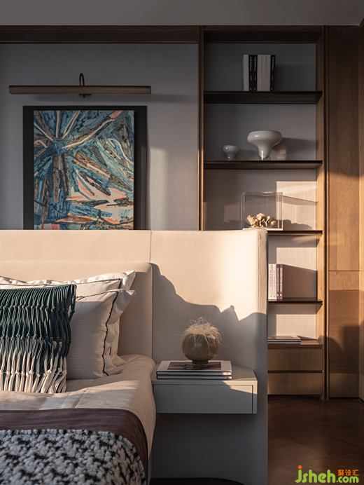 主臥空間雅致幽靜,予人一種放松的享受。皮革構(gòu)成的半包圍型床背,光與影的相互交映,營造出空間溫暖氛圍感。與之搭配的藝術(shù)裝飾畫,生動(dòng)起伏的肌理感,讓空間變得更現(xiàn)代化、更具有藝術(shù)性。