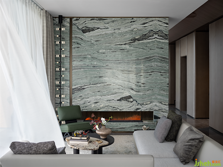 大理石的自然肌理將山的哲學(xué)轉(zhuǎn)譯為空間語(yǔ)言,山川涌動(dòng),曲折多姿,在此刻演繹著空間的