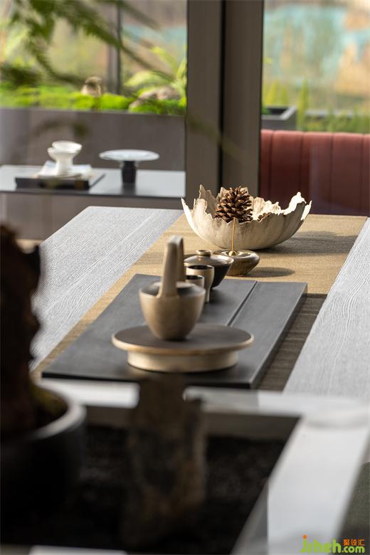 樸拙的茶臺(tái)與精致的茶具形成對(duì)比,清雅氣息在空間中盎然生長(zhǎng),抒寫(xiě)曠遠(yuǎn)靈動(dòng)的詩(shī)意。