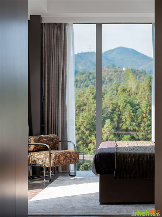 與云為伴,與鳥為鄰,大尺度的落地窗將自然之姿寫入次臥空間,并以簡(jiǎn)潔明朗的線條結(jié)構(gòu),