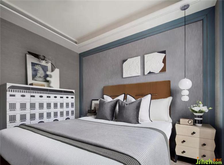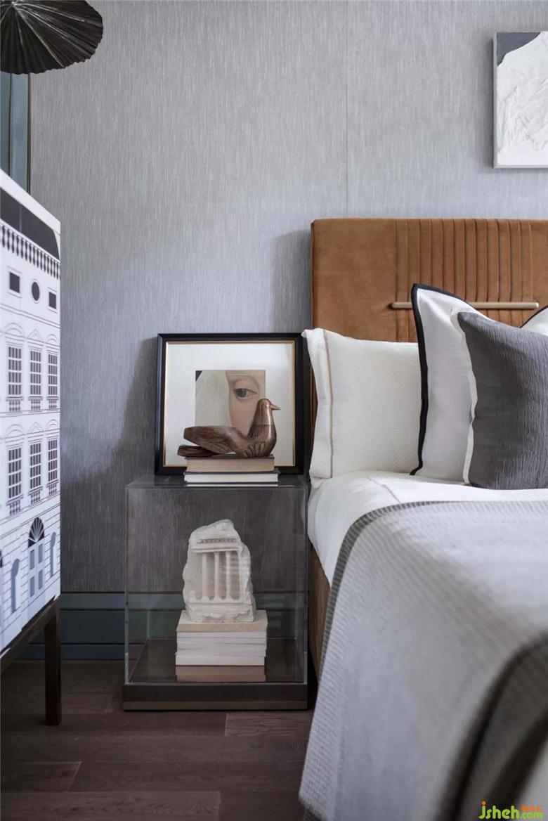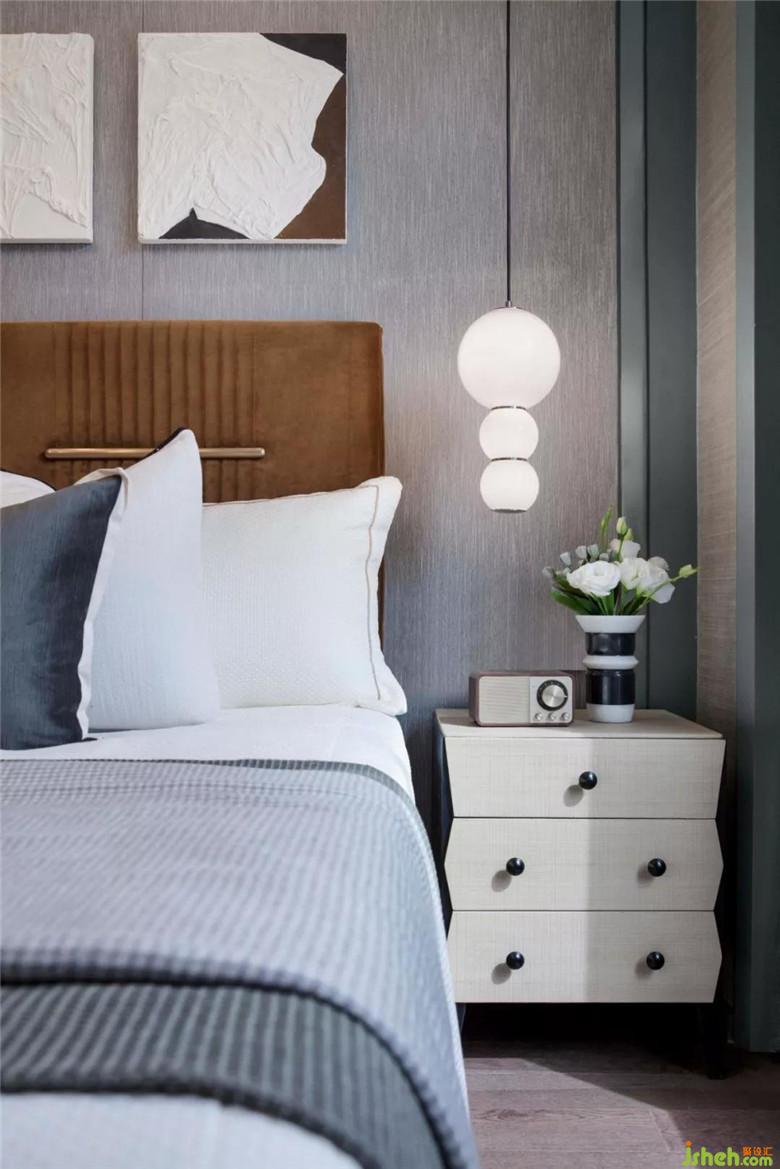 長(zhǎng)輩房空間色調(diào)更加穩(wěn)重,選用大量的灰色調(diào),營(yíng)造空間安靜的氛圍。在寧靜平和的睡眠氛圍中,柔軟的織品更添舒適感。金屬質(zhì)感的鳥與空間主題輝映,幾何燈具打破了深色軟式的沉悶,令空間更為平衡。