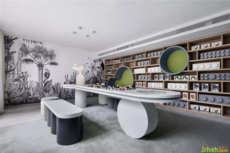 白色為主的個(gè)性不規(guī)則桌子,一處以圓形支撐的設(shè)計(jì)靈動(dòng)了空間,木色櫥柜擺滿了益智玩具與叢林書籍,從兒時(shí)熏陶人類與自然的知識(shí)世界。