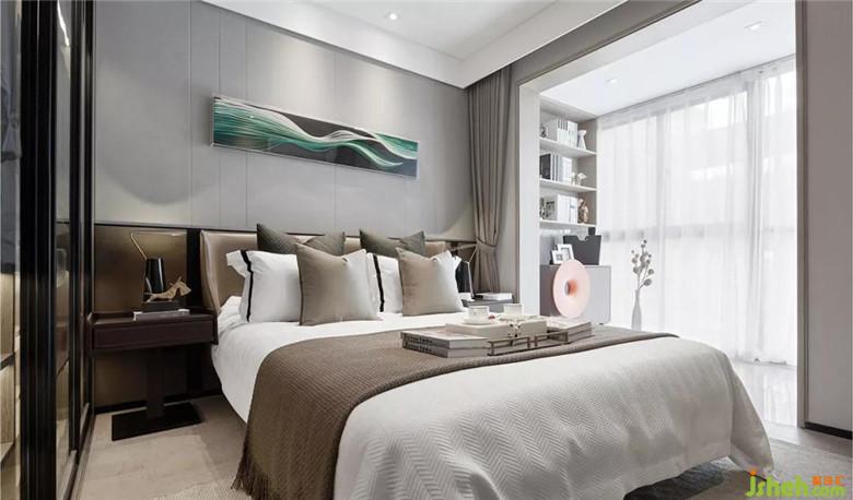 床作為臥室的核心,灰棕色的床品端莊穩(wěn)重,觸感柔和舒適。背景墻上的藝術衍紙點綴空間。窗簾薄紗清透,引入天光,空間呈現(xiàn)舒適安逸的氛圍。