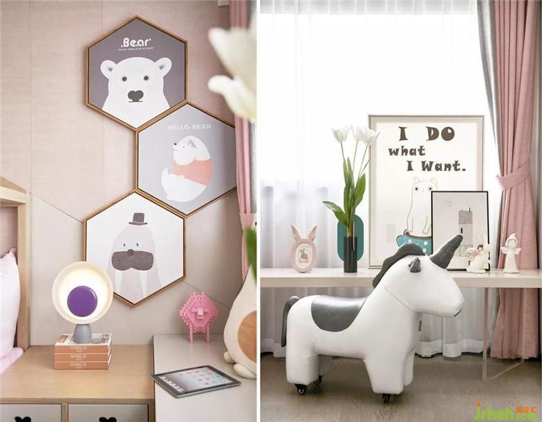 兒童房是一方夢幻的小天地。柔和的色調(diào)似真似幻,讓人不自覺的放輕腳步。可愛的獨角獸,童話精靈擺件,純潔的花藝,是小主人美好的夢中場景。