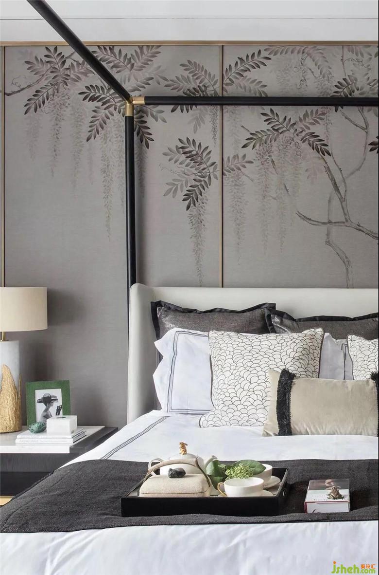 主臥的灰綠色真絲墻面,是蔓藤手繪畫作的背景,從窗簾、床榻、植物到藝術(shù)裝置,這一抹寧靜且深沉的綠,娓娓道來的,是空間之生命力。