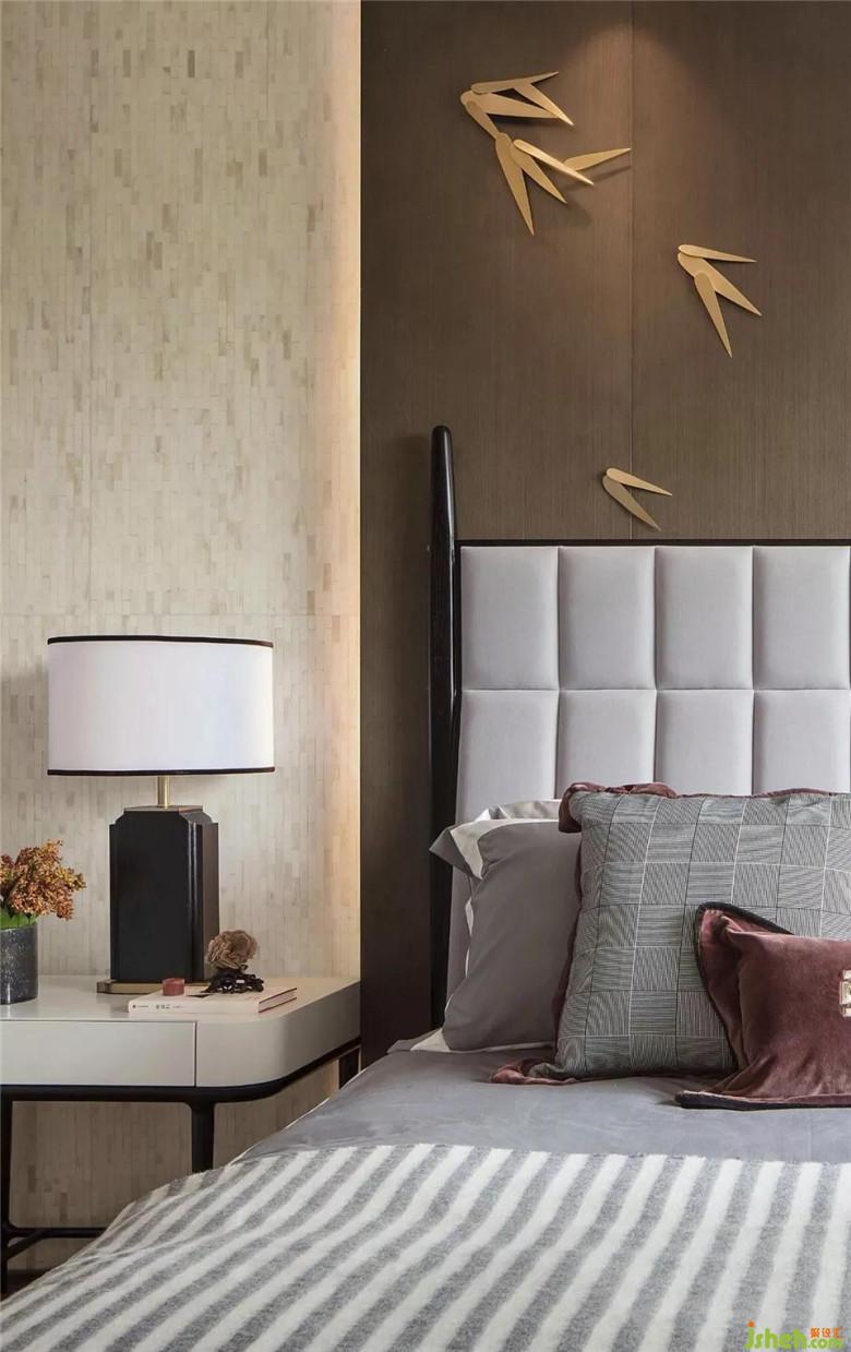 在老人房的處理上,窗前的遠山景色被凝練于高低錯落的屏風之上,青松盆景、墻上金屬葉片自然的元素與生活的崇高詩意在此融為一體。