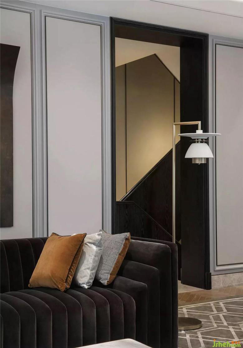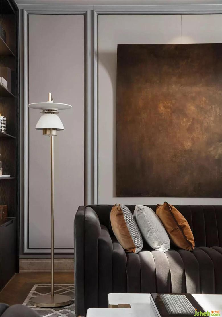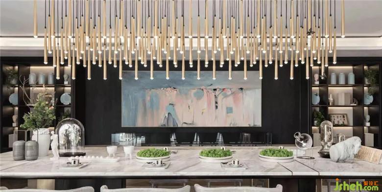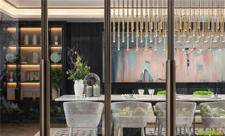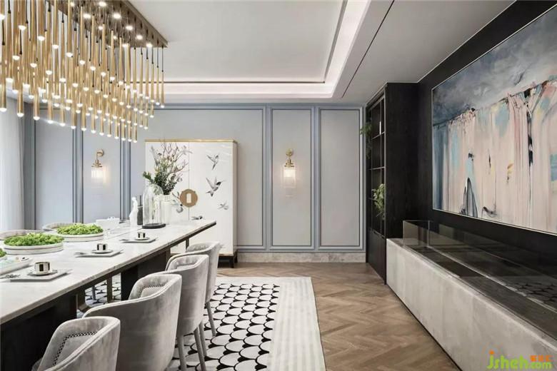 與書房區(qū)不同,線條的呈現(xiàn)方式,在女主人的下午茶空間變得溫柔了許多。從地毯的扇形拼接、線型吊燈的錯落秩序,到座椅的優(yōu)雅姿態(tài),將當(dāng)代東方女性的韻味淋漓展現(xiàn)。