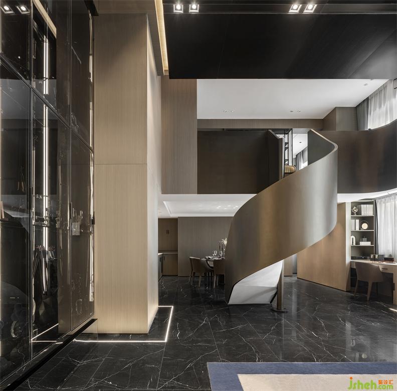 卡座旁設(shè)置棋牌區(qū)和卡座區(qū),與洽談區(qū)交互共融。多功能區(qū)臨窗而設(shè),可供把玩腕表,指針劃過空間,瞄準蒸蒸日上的方向。旋轉(zhuǎn)樓梯對客餐廳區(qū)域自然劃分,餐廳區(qū)域空間典雅整潔,黑色大理石地磚與木色軟裝墻壁、暖咖色的餐桌椅簡而不華,不適優(yōu)雅。黑色不銹鋼和燭臺,在燈光襯托下,質(zhì)感晶瑩,立現(xiàn)生活質(zhì)量感。曲型旋轉(zhuǎn)樓梯蜿蜒而上,呈現(xiàn)大氣沉穩(wěn)姿態(tài)。儲酒間私密而又獨立,杯盞搖曳間,放松工作與生活的的緊湊感,達到舒適愜意的優(yōu)雅從容。