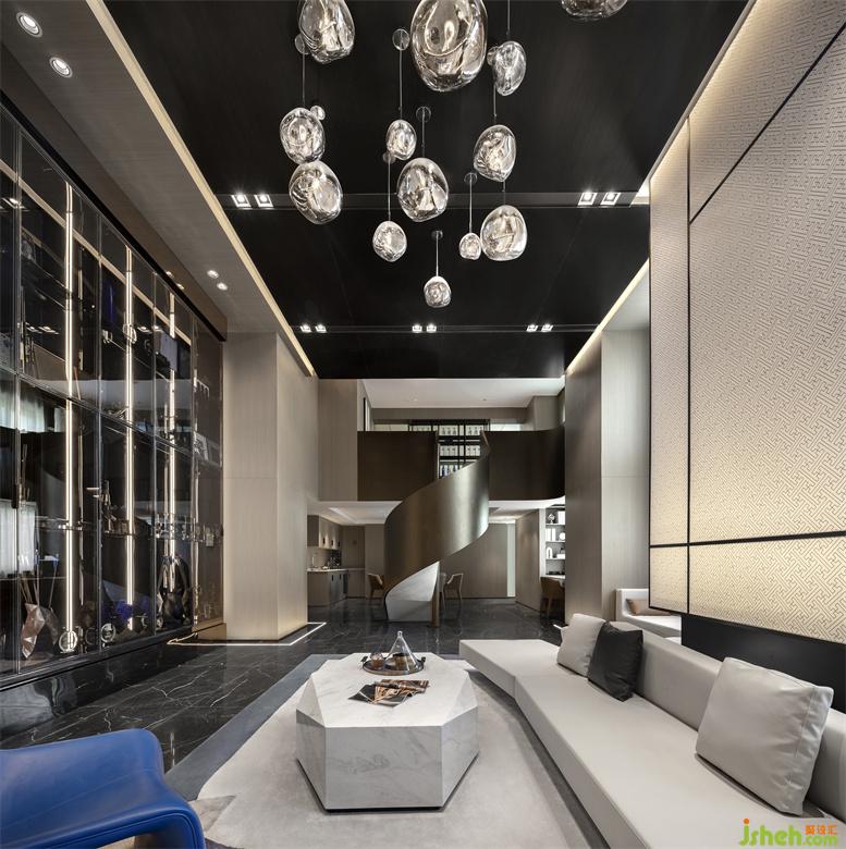 樣板房設(shè)計空間大膽采用黑色不銹鋼裝飾,中性色木飾面,布局簡約大氣,內(nèi)容精煉有趣。在軟裝上,用“精致”二字作為關(guān)鍵詞,方便大家更好地理解我們的主題思路。藝術(shù)裝置吊燈從上空懸垂而下,一束光將訪者邀入至臻的純凈中,璀璨光感增加空間靈動的質(zhì)感和流暢的現(xiàn)代感。充滿尊貴氣息的棕色面料,是自帶高級感的;空間白色理石茶幾的光澤感,活力藍色調(diào)呈現(xiàn)的活潑輕快之感,為空間注入時尚而別致的氛圍;黑橡木色平衡了視覺空間的色彩搭配,給人以冷峻、酷炫之感。