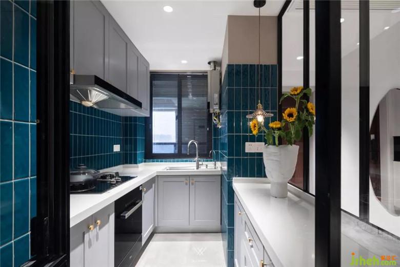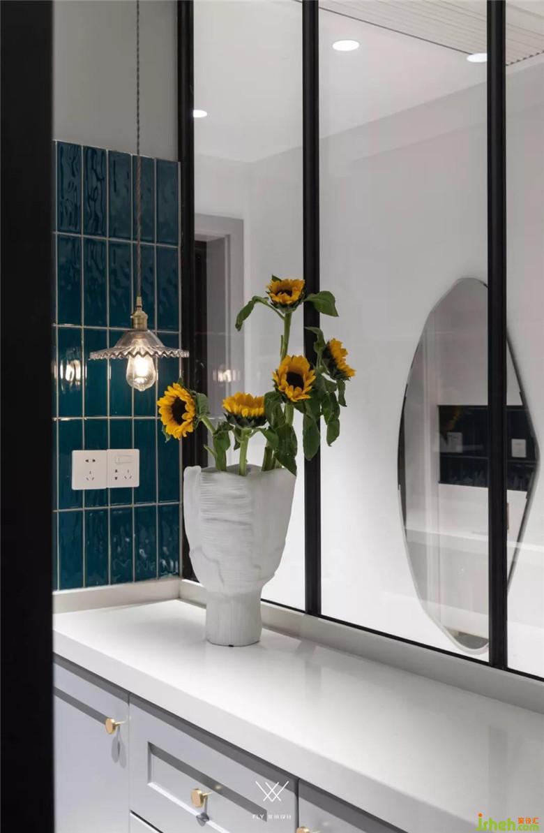 因為不接受開放式廚房,但設(shè)計師又希望廚房可以和周圍空間聯(lián)系,所以改變了廚房的隔墻材料,這樣就不會因為廚房面積小,給空間帶來壓抑。又因為通透的設(shè)計,讓廚房成為了設(shè)計中的一部分,既讓空間聯(lián)系,又不需要為了造型而造型,沒有實用的藝術(shù)呈現(xiàn),在預(yù)算上也省下了一部分。通過廚房的墻體外推,冰箱空間的位置調(diào)整這樣一來廚房就多出了輔助臺面的功能需求,滿足了使用。