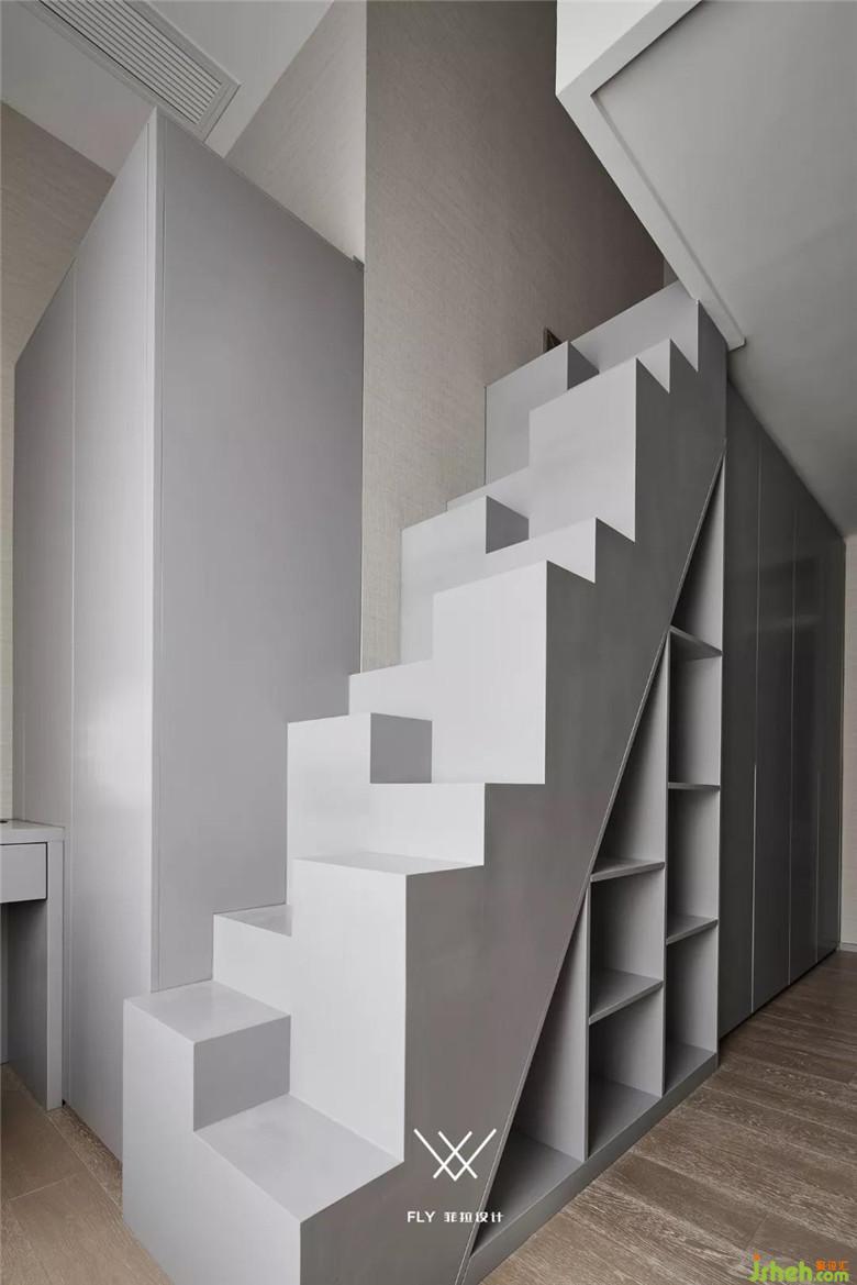 衣帽間左右兩排布置,男女主人衣物分開存儲(chǔ),擁有大面積的采光窗,有獨(dú)立的梳妝臺(tái),衣帽間內(nèi)部利用了僅0.7m2的空間設(shè)計(jì)了一部微型樓梯通往閣樓,增加了大量的存儲(chǔ)空間。