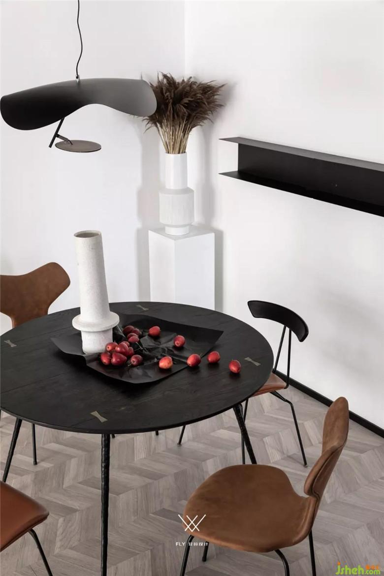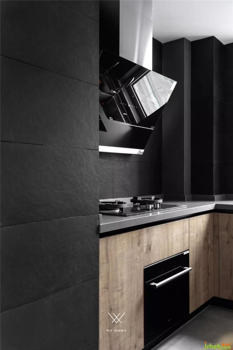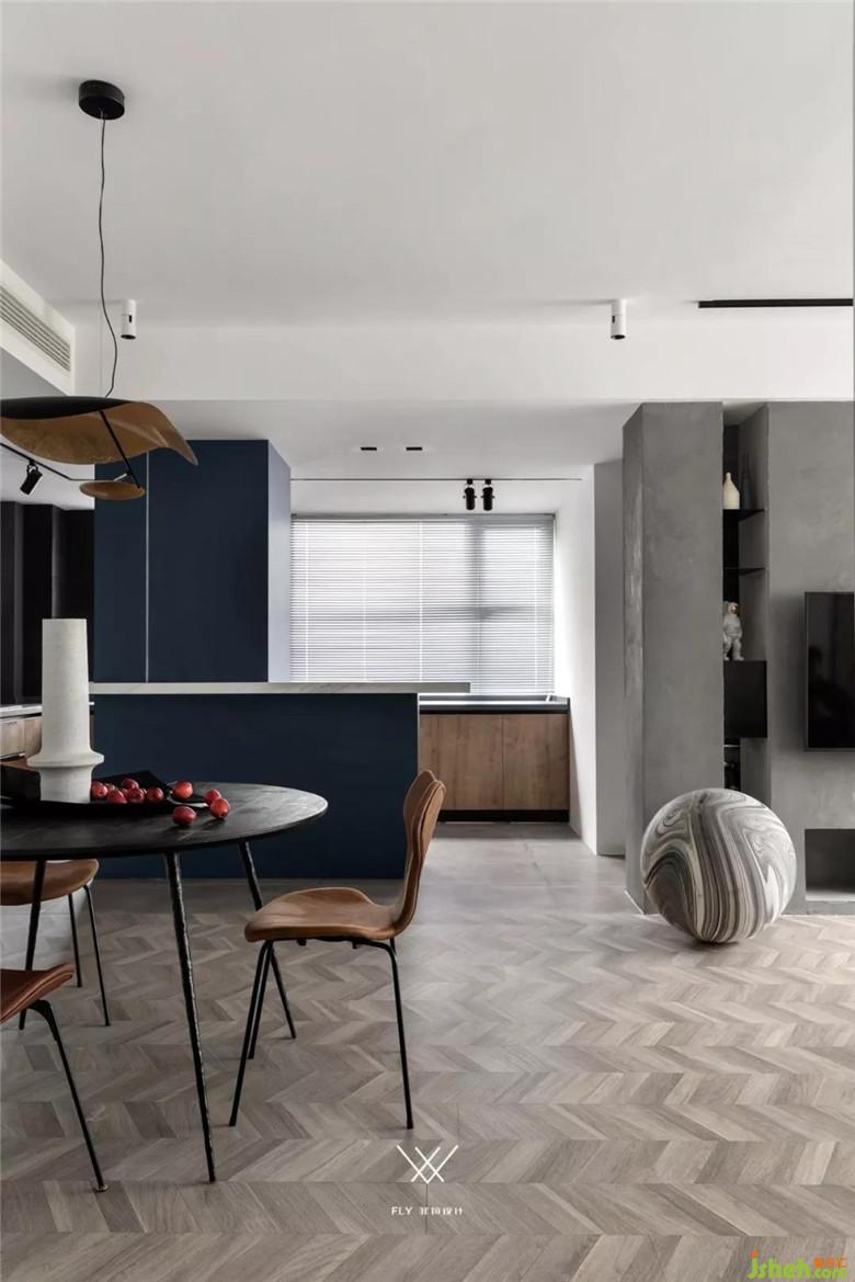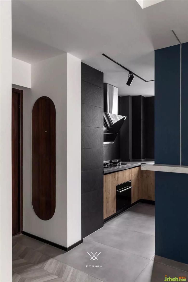 色彩要素在開放式的廚房設(shè)計(jì)上有更多的比重,因?yàn)榭蛻艚o了一定的要求。希望偏男性的色彩,點(diǎn)綴色上就選擇了深藍(lán),它的沉穩(wěn),既能表達(dá)出男業(yè)主的性格,同時(shí)也能讓空間安靜。藍(lán)色作為吧臺結(jié)構(gòu)穿插的主角,配合上開放式廚房的黑色瓷磚和木色門板,通過色彩讓空間在視覺上產(chǎn)生區(qū)域的劃分。