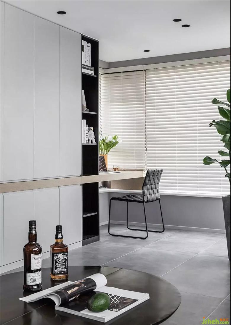 為了擴大廚房的可用臺面加大空間的利用率,從玄關(guān)處進入廚房,同時將書桌與儲藏柜和電視背景墻穿插,使空間的休閑書房,客廳,餐廳連成一體,在視覺上加大空間的通透性。