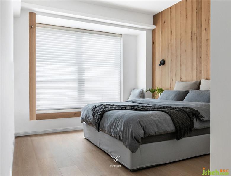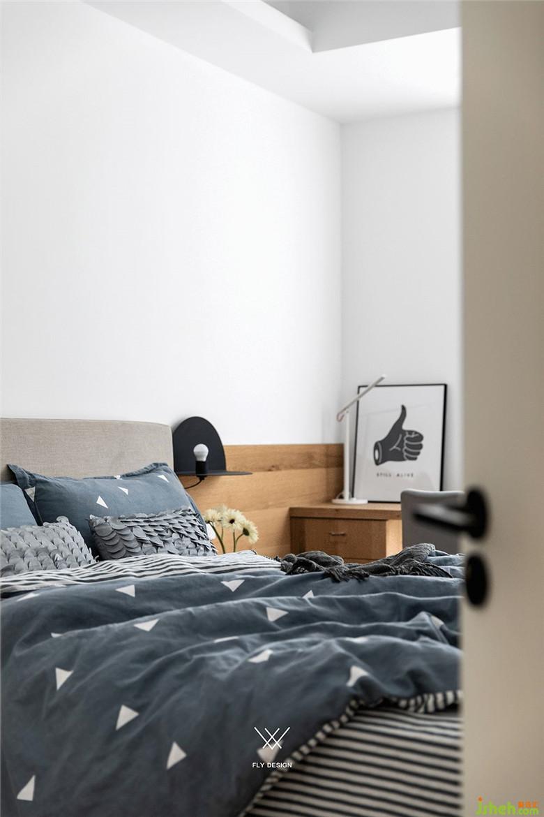 木頭做成的床頭和裝飾畫使屋子酷起來,床頭柜上的擺件與整個空間一起生出流行藝術氛圍。