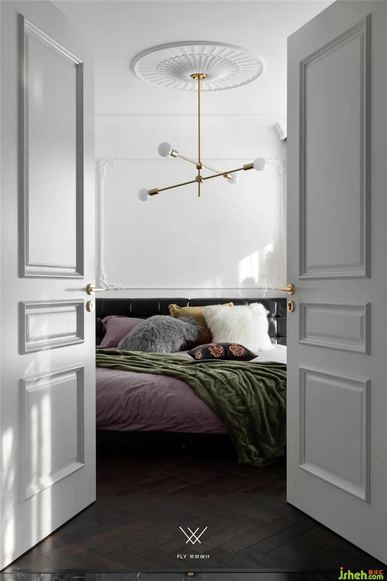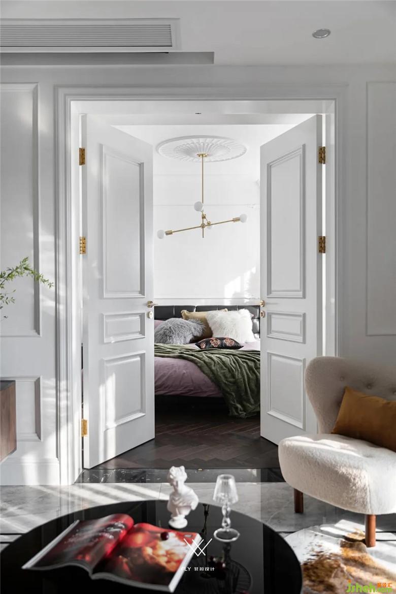 主臥的雙開門增強儀式感,也最大限度的打開了客廳和主臥的互動性,兩者之間主體家具均以軸線對稱。裝修公司將轉(zhuǎn)換成雙動線可以讓空間被充分利用起來,原有進主臥的通道改成衣帽間,這樣原來不大的主臥開間的尺度被完全保留下來,床尾還能再增加衣柜體量和梳妝臺的位置。