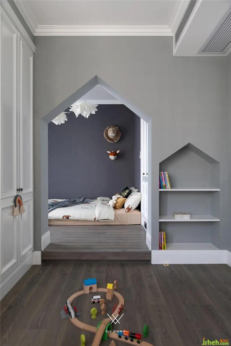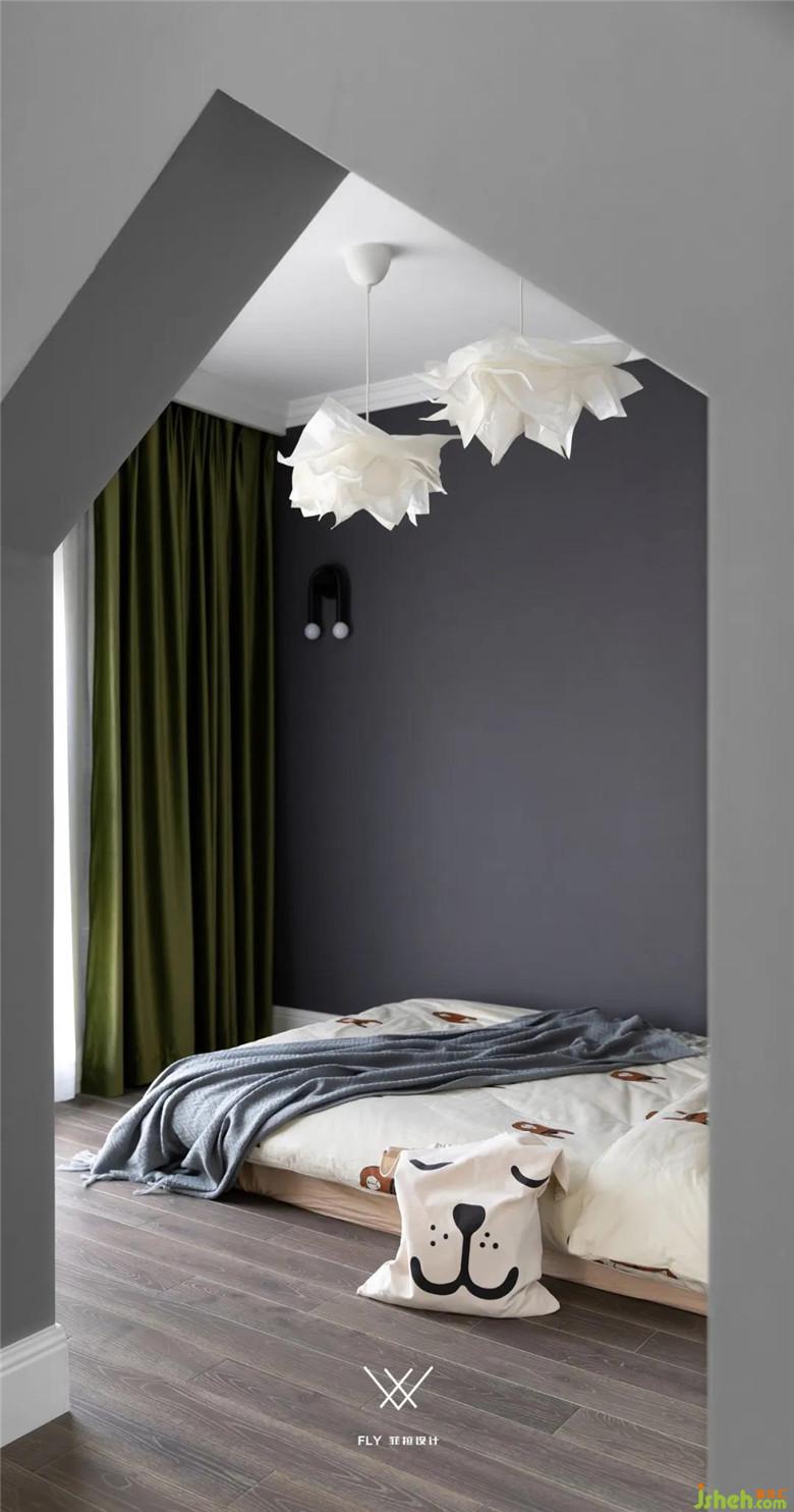 原本小孩房是兩個獨立的空間,為了增加聯(lián)動性不再做封閉式的門,由門洞聯(lián)結(jié)合二為一。裝修公司在這個空間里做了動靜分區(qū),朝東房間抬高做睡眠區(qū)域,床墊直接擱置地臺上,趣味性十足,朝北的房間則是活動玩耍做功課的空間。