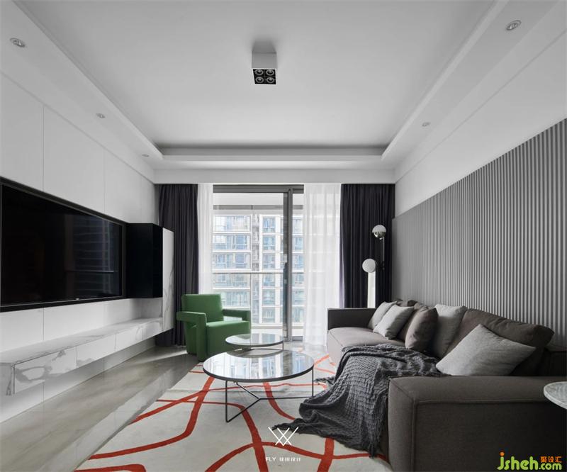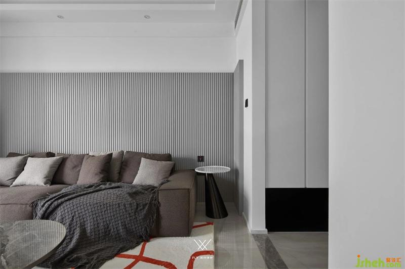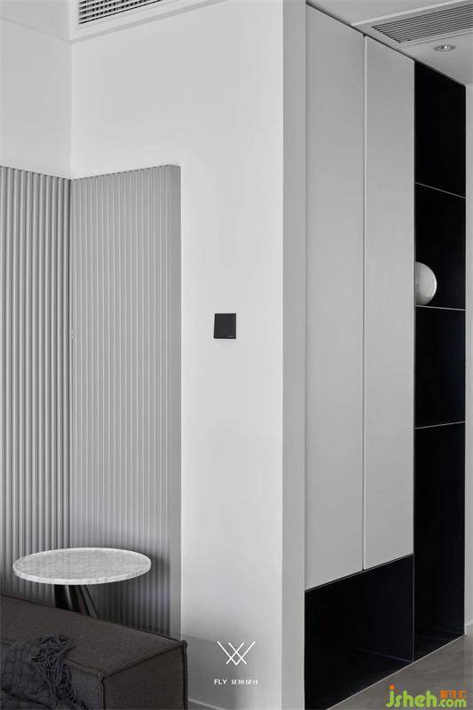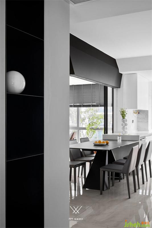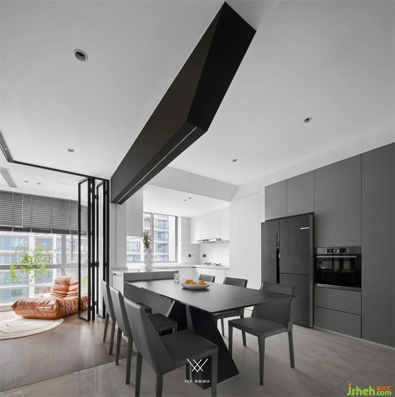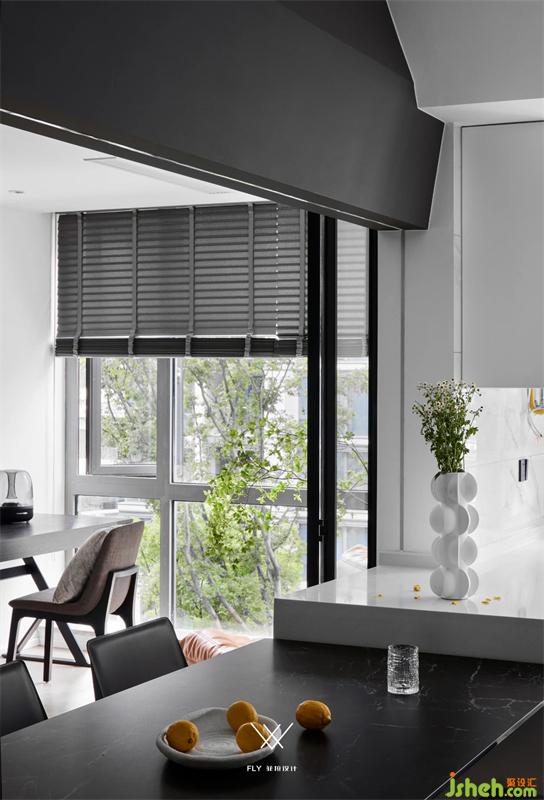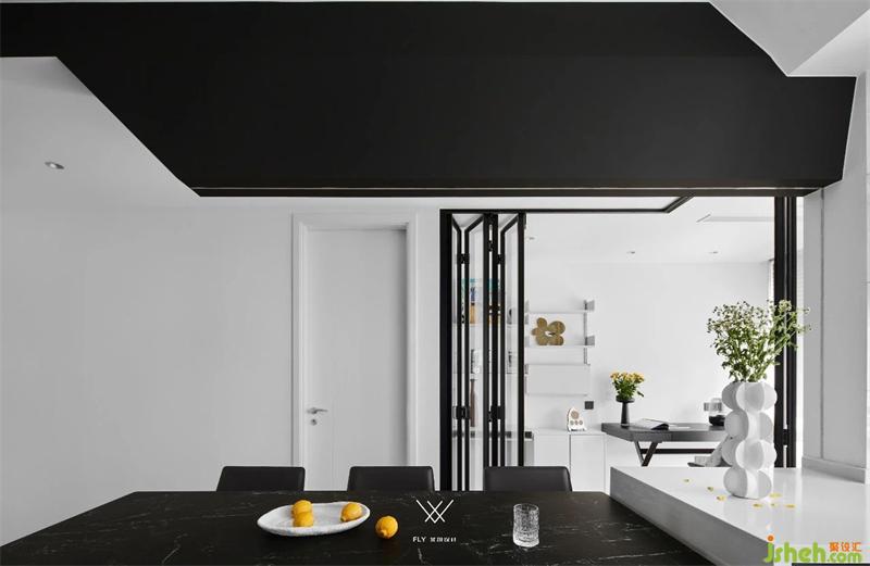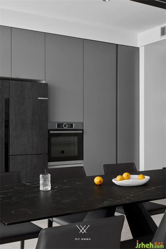 吝色黑白灰,破而重組的開闊,空氣里光的振動隨之翩翩;開放式廚房、半開放式書房,流動的空間給予的讓步,餐邊柜默念著禮貌加入的詞根。