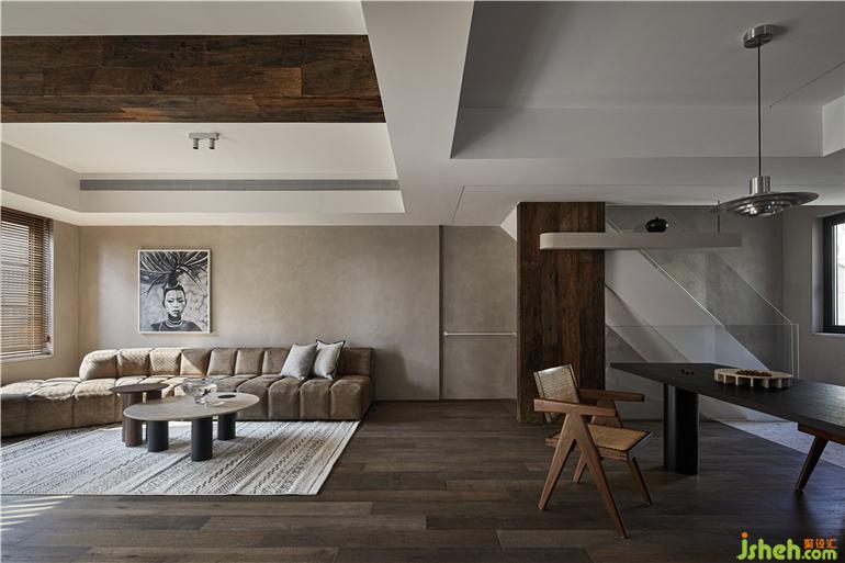 客廳在房頂做梁,樓梯做柱,建筑藝術穿插結構的形式將老木頭放置其間,滿足居住者家居空間里要有老木頭運用的要求。