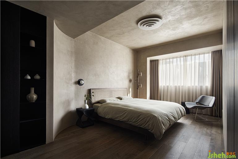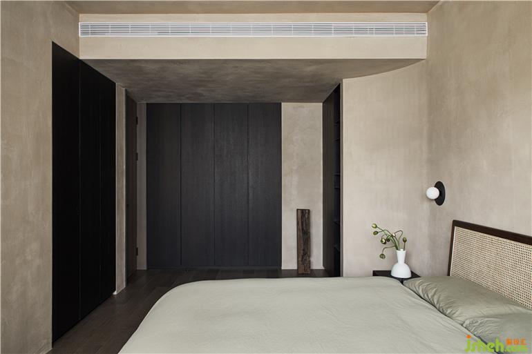 臥室主打暖色調(diào),選用偏黃色藝術(shù)漆營(yíng)造老房子土墻效果,沒(méi)有冗贅的裝飾,歸還純粹的睡眠空間。杭州家居設(shè)計(jì)重組空間結(jié)構(gòu),柜體推入墻體,墻面延伸曲面連至衣柜,空間銜接順暢干凈。
