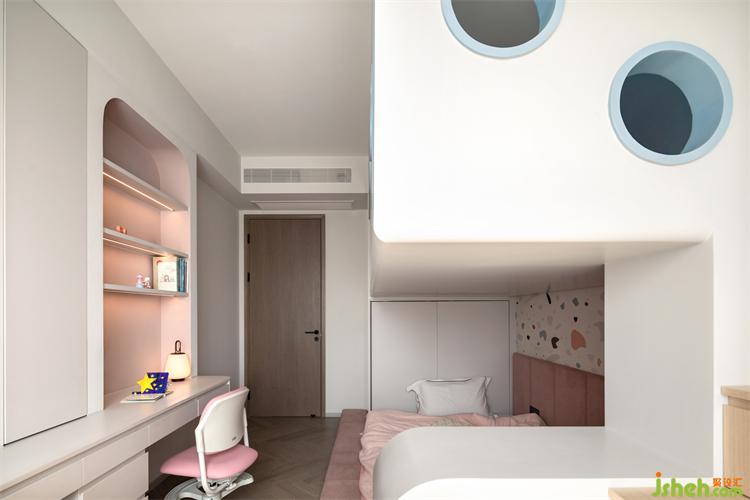 兩個小朋友的睡眠空間,杭州秀隱翠精裝房改造打造燦日余暉、閃閃發(fā)光的童話氛圍,鋼架結(jié)構(gòu)組建上下雙層床,分色處理劃分兩人空間,多處做圓角處理,是細節(jié)處給予孩童的安全保護。