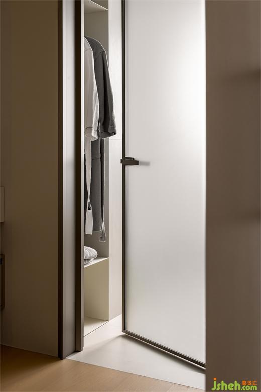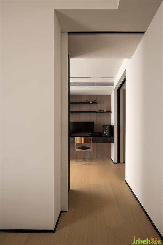 集結(jié)多種功能屬性——衣帽間、書(shū)房、洗衣區(qū)于同一空間內(nèi)妥善安排,整合空間的利用率與便利性,且將之以相對(duì)開(kāi)放的姿態(tài)呈現(xiàn),雙移門(mén)得以應(yīng)對(duì)不同情景下的空間需求,空間互通性與獨(dú)立性兼具。柜門(mén)以鏡面手法擴(kuò)容視覺(jué)空間,杭州海潮雅園裝修設(shè)計(jì)在保證充足的儲(chǔ)物空間下協(xié)調(diào)其帶有的體量,平衡家居功能與空間體感的雙重需求。