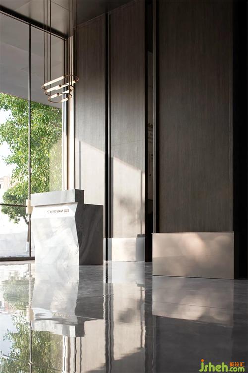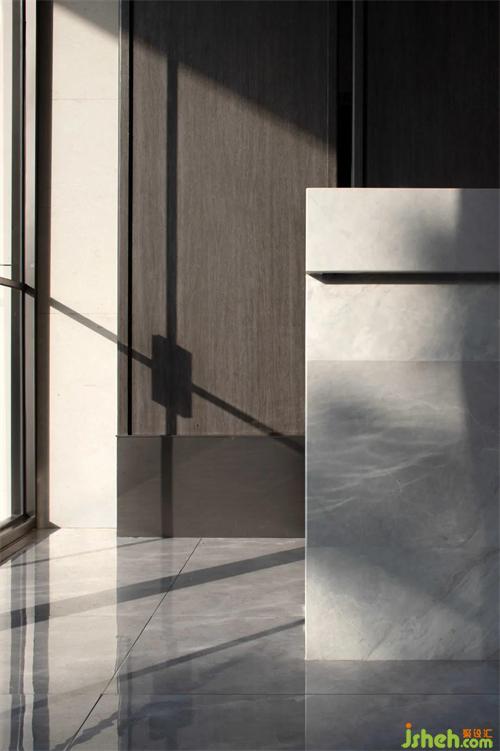 售樓處入口的接待大堂,是一個(gè)擁有沉靜安寧氣場的空間,而在這個(gè)灰色調(diào)的空間中,一塊完整的山水紋大理石如同山水長卷般在空間中心徐徐展開,它和極簡的大理石肌理構(gòu)成了接待臺(tái)的全部體量。