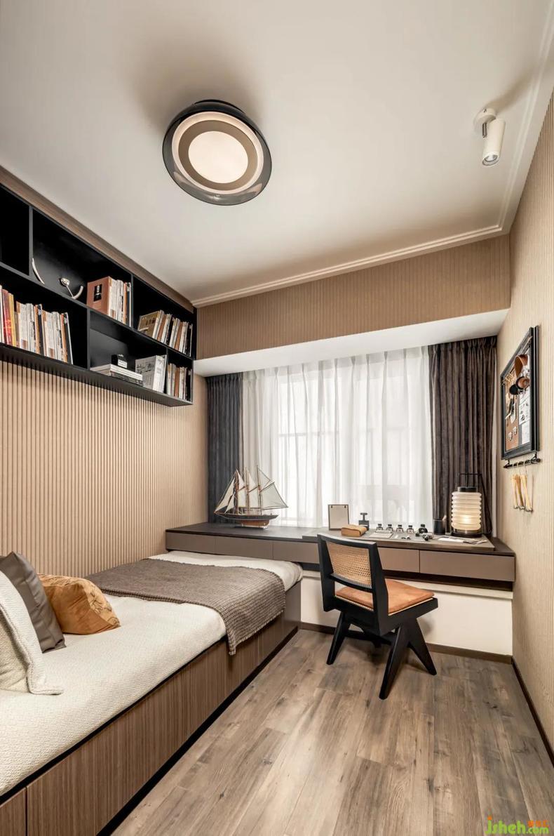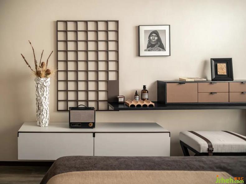 松軟的布藝、細(xì)膩的木質(zhì),層層疊疊,凸顯出側(cè)臥精致的生活品味,陽(yáng)光從絲質(zhì)的窗簾縫隙中滲透而下,于此,靜享安然自在的片刻時(shí)光。