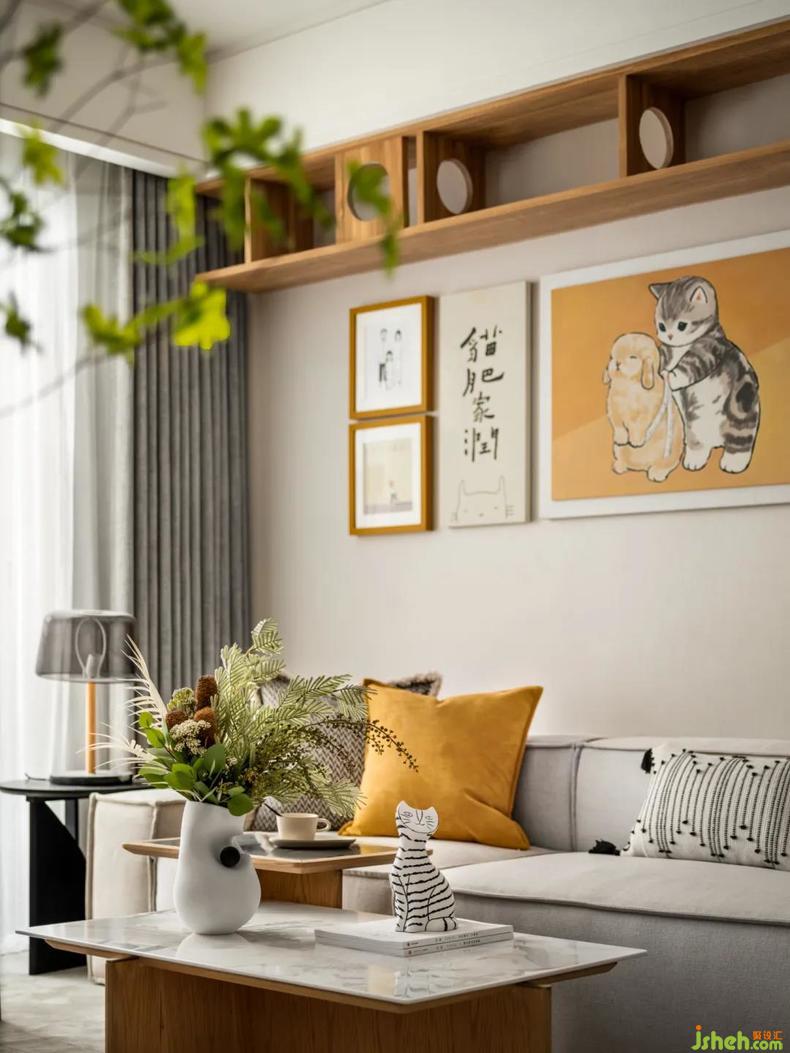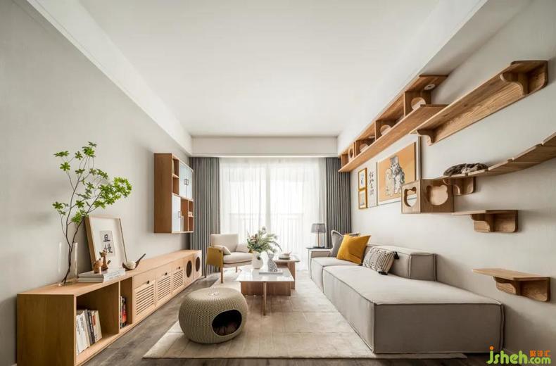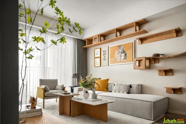 飄紗的落地窗捕捉了燦爛的陽(yáng)光,簡(jiǎn)單純粹之余,又塑造開(kāi)闊的畫(huà)面。原木柜子、貓爬架和灰白色的墻面搭配,樣板房設(shè)計(jì)使生活多了一份溫暖與簡(jiǎn)素回歸本真,灰白的沙發(fā)上跳躍著暖棕的布藝抱枕,深沉的玻璃原木小客桌于地毯上協(xié)調(diào)呼應(yīng),清新淡雅的特質(zhì)能充分營(yíng)造出令人放松的愜意生活氛圍,呈現(xiàn)回歸本質(zhì)生活