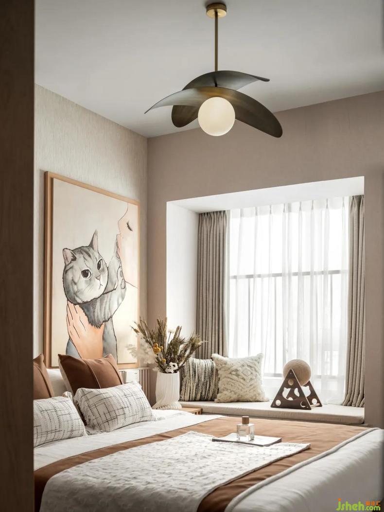 橙色的臥室,延續(xù)了空間的沉靜,視覺(jué)上更顯溫暖。樣板房設(shè)計(jì)床背增加燈帶輔助照明,植入藝術(shù)品元素,婉約地將藝術(shù)感與空間的氣場(chǎng)共融,使得維度內(nèi)線條表達(dá)與意識(shí)存續(xù)變得流動(dòng)而自由。在這個(gè)男女主人的私享空間里,用他們情有獨(dú)鐘的橙色和可愛(ài)貓貓掛畫(huà)點(diǎn)綴其間,也是家中流動(dòng)的趣味。