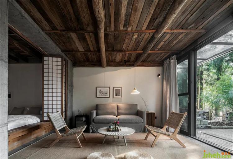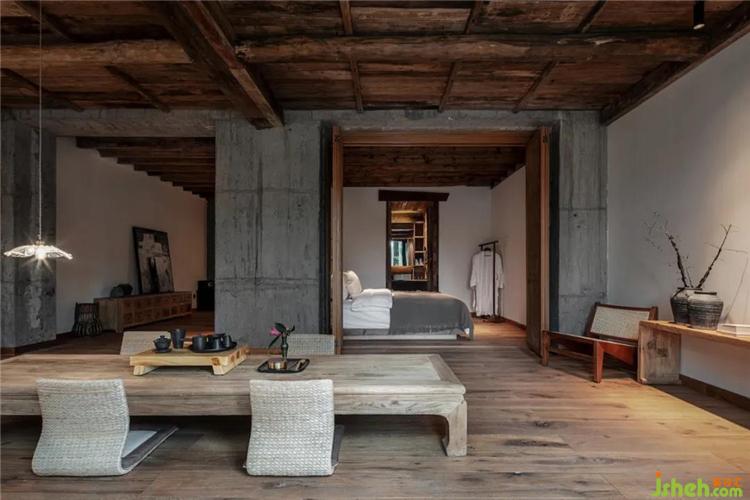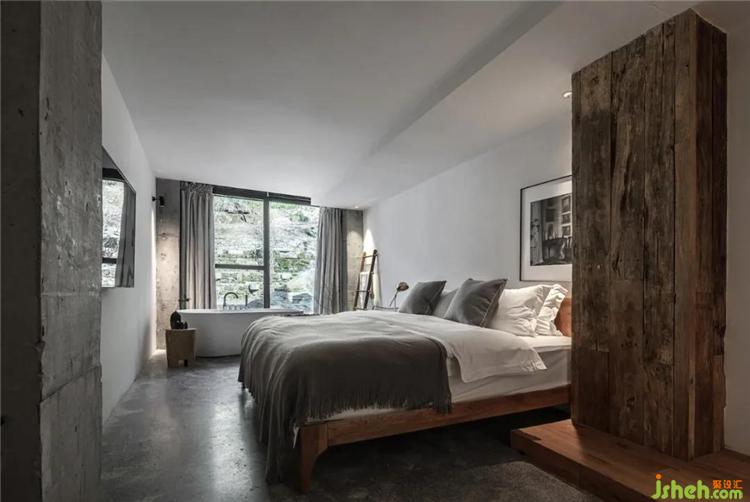 挑高的空間架構(gòu)中,通過天花與墻面連續(xù)的設(shè)計(jì),塑造出空間整體風(fēng)格的延伸性,各個(gè)區(qū)域直接的轉(zhuǎn)換自然而流暢,從而打破了常規(guī)民宿空間的形制特點(diǎn)與界分感,于簡單中加以微妙的轉(zhuǎn)折,呈現(xiàn)出空間簡凈大方的當(dāng)代氣息。