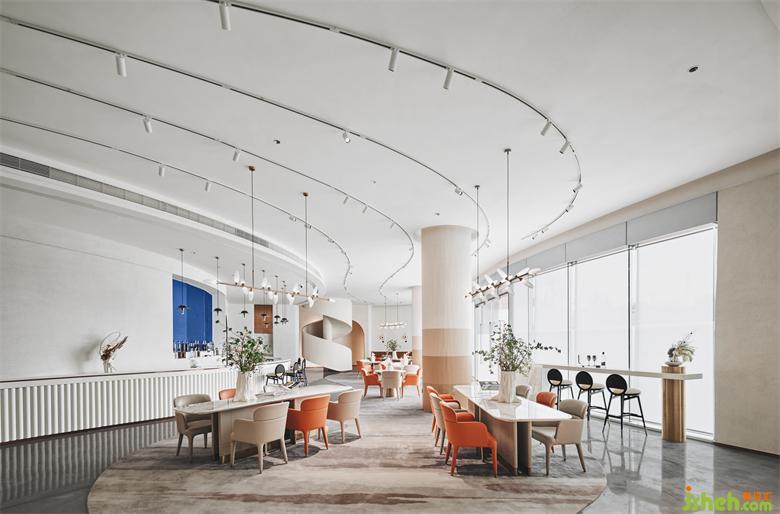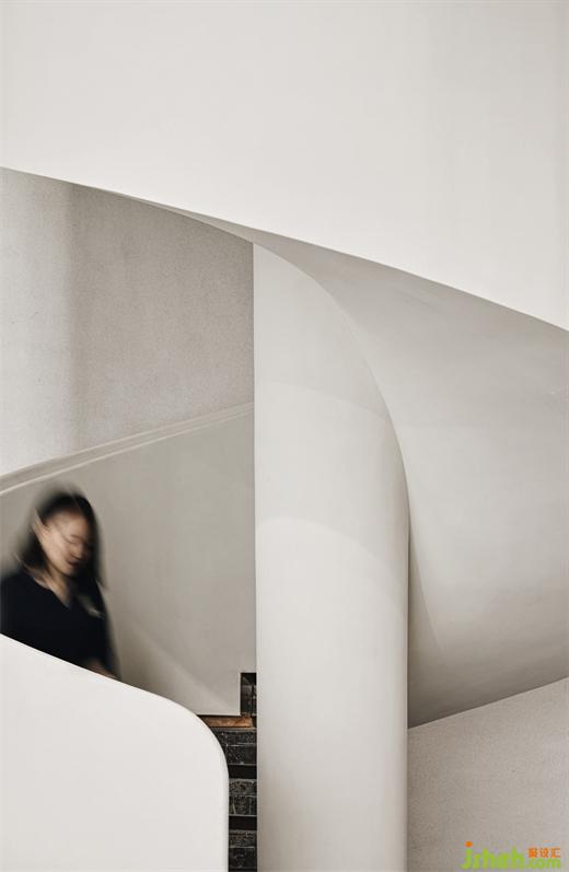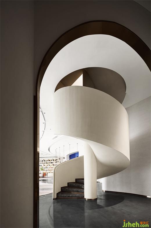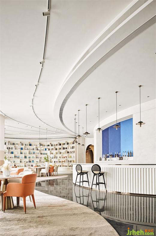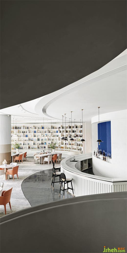 如同從墻面悄然長(zhǎng)出來一般的吧臺(tái)區(qū),和建筑的生長(zhǎng)異曲同工,利用材質(zhì)本色與重新編排所呈現(xiàn)的肌理,將抽象的語匯記敘在這座建筑輪廓里。一層層迭代的浪花天頂?shù)奶幚?,蜿蜒?yōu)雅,延續(xù)無盡的“春意”,通過空間與人的互動(dòng)產(chǎn)生新的碰撞。