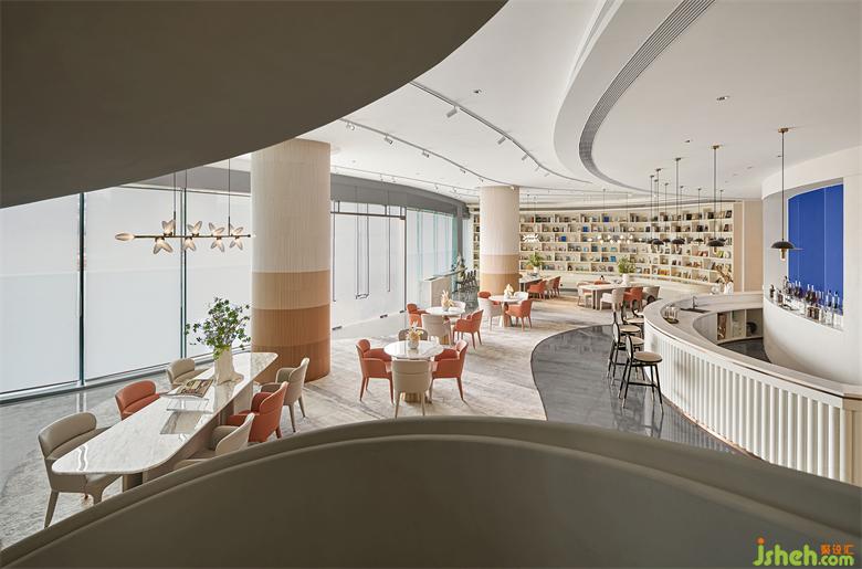 在負(fù)一樓清吧區(qū)域,色彩會(huì)更加的年輕活躍。隨意可落座的蜿蜒階梯書吧,配合不同形式的洽談桌椅,營(yíng)造出豐富的空間層次,充滿質(zhì)感的皮革,純凈的花藝與綠植,在開闊的空間內(nèi)形成平衡量感,充滿自然與現(xiàn)代文明的和諧秩序之美。