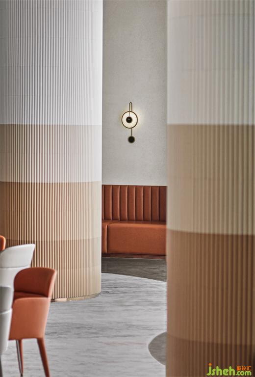 立柱的漸變處理,利用小石材的豎向拼接,將豎向陣列元素延續(xù)到底。宛如中國(guó)畫般,時(shí)而流動(dòng),時(shí)而聚集,創(chuàng)造更趣味的空間體驗(yàn)。
