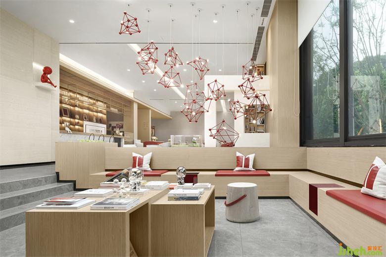 下沉式圖書區(qū),結(jié)合重慶網(wǎng)紅書店,鐘書閣、南之山、精典書店山、時光里獨立書店……網(wǎng)紅元素,讓中國紅的延續(xù)至此,創(chuàng)造輕松自由的落座空間,讓人們可以舒適的停留下來,信手拾起的書。