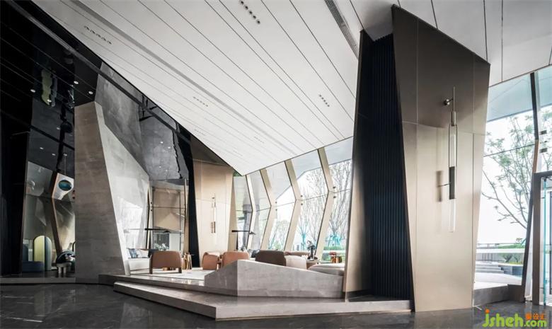 建筑大師賴特曾說(shuō),建筑是用結(jié)構(gòu)來(lái)表達(dá)思想的科學(xué)性的藝術(shù)。空間體塊與線條穿插呼應(yīng),以解構(gòu)主義風(fēng)格斜刺出挑,聚攏成突破性的視覺(jué)焦點(diǎn),為空間內(nèi)寶石切面質(zhì)感的引入,搭建出“舞臺(tái)背景”。