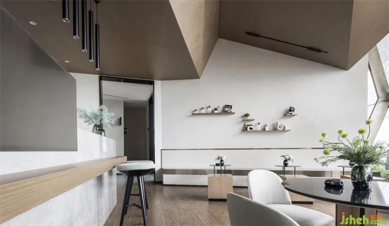 大面積的玻璃落地窗,讓自然光線進(jìn)入,若即若離的景色變化以及戲劇性的情感體驗(yàn),激發(fā)訪者的想象情境;在樹(shù)影點(diǎn)光的映射下,置身于弧形洽談區(qū)之中,仿如被空間包裹著。在弱化空間界限性的同時(shí),希望訪者憑借內(nèi)心的回憶為空間添上顏色。