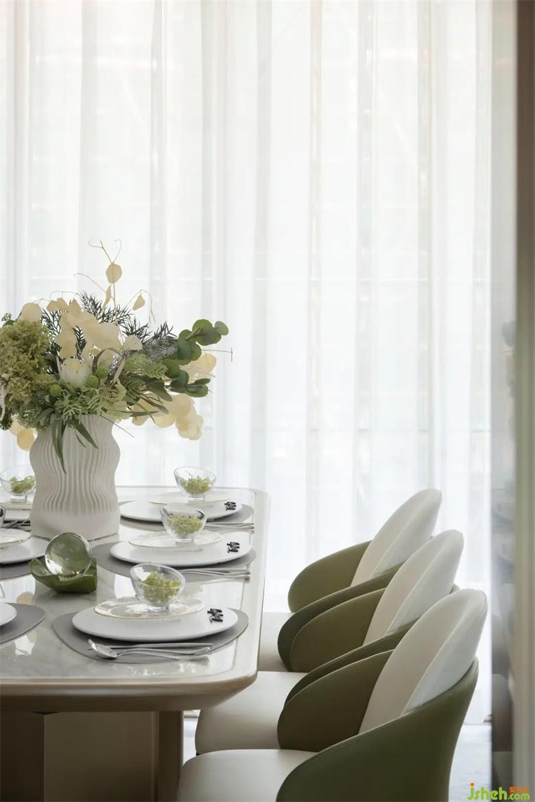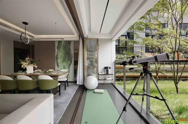 植物的巧妙點綴,營造出一種淡淡的優(yōu)雅感,樣板房設計包容、輕松的氛圍。餐廳打造輕食的生活氛圍感,景觀陽臺,設置瑜伽區(qū),從而表達出健康生活的本質。