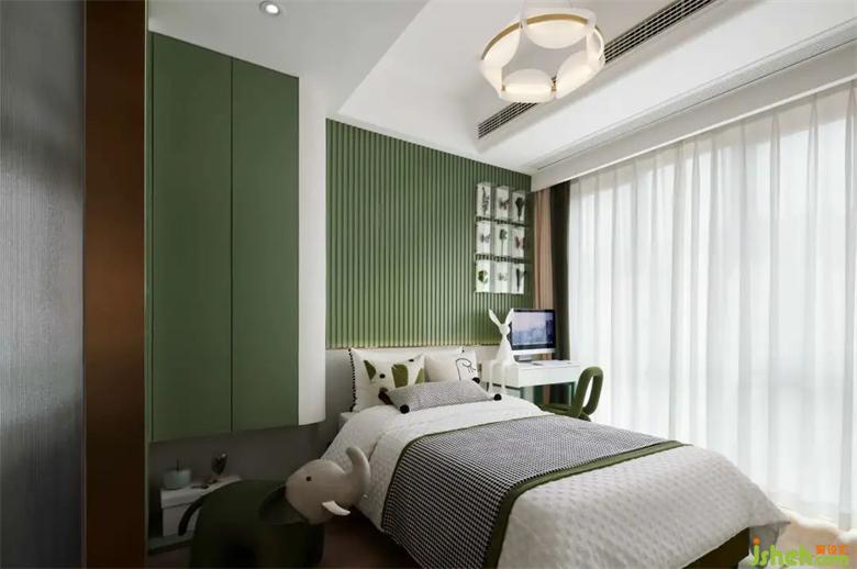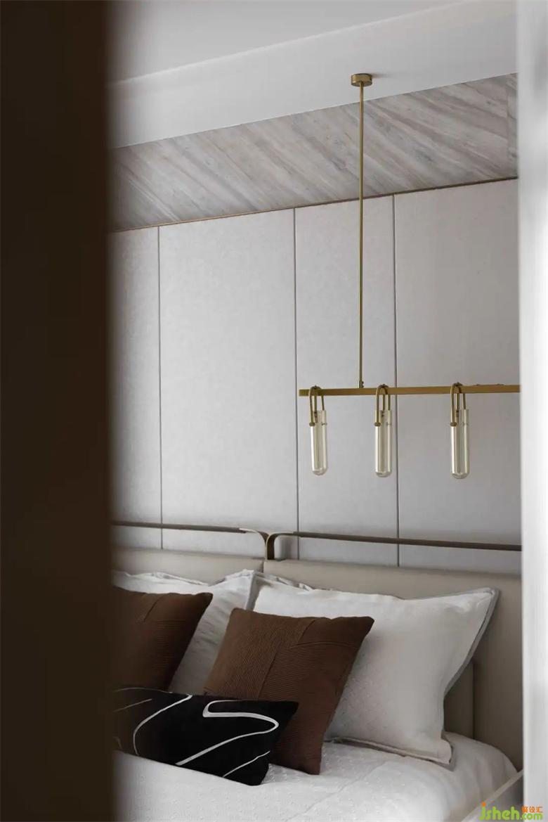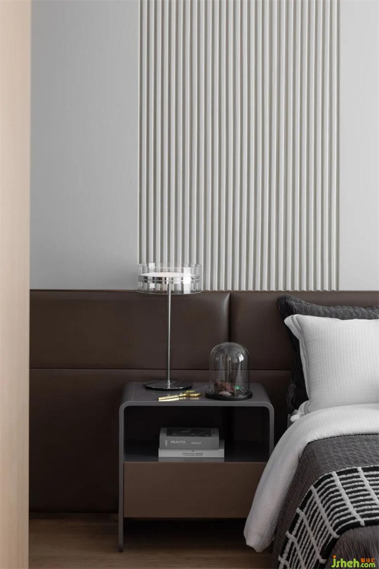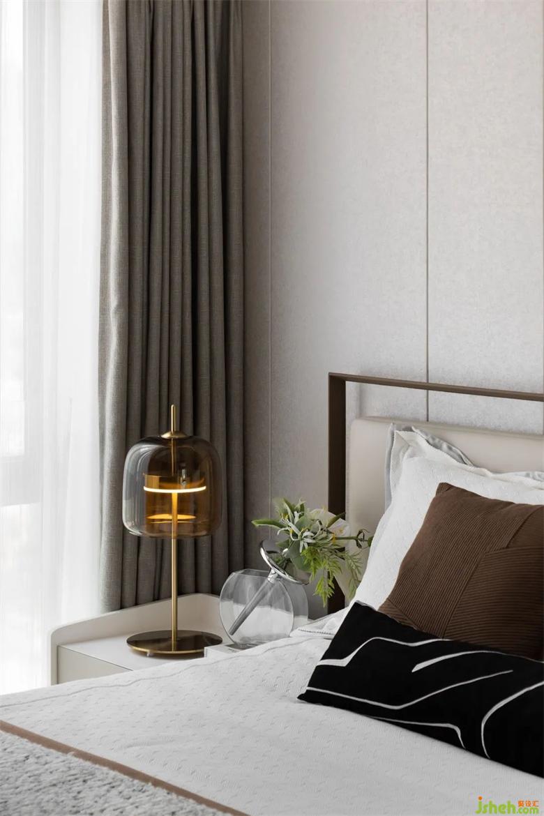 次臥以線條的變化給空間帶來了律動感,色彩的升級,也賦予這個空間更為祥和的寂靜感。樣板房設計以小見大,以方寸天地見萬物新生。