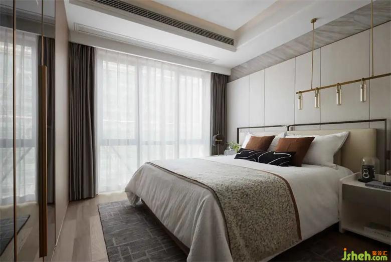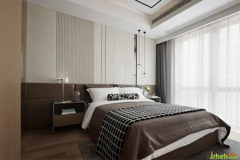 主臥套房臥室分割了更多空間,展示現(xiàn)代都市生態(tài)的風味?,F(xiàn)代與自然融合,樣板房設計打造出休閑散漫之氣,既顯品味又不落俗,形成繁中有簡的現(xiàn)代生活大空間。