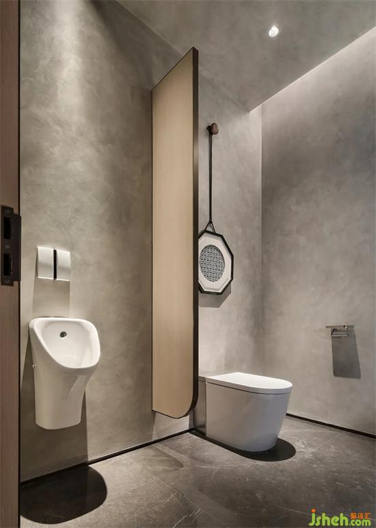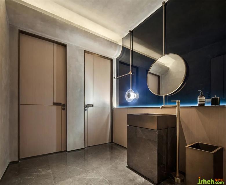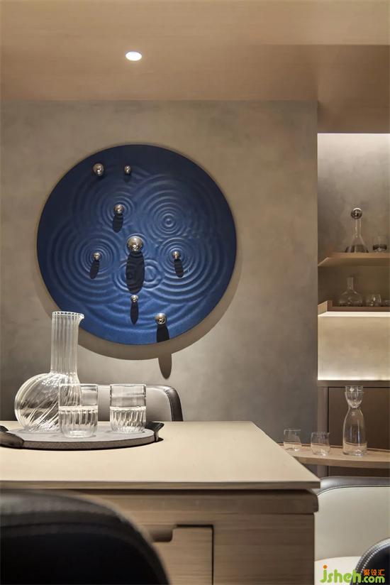 會所設計扎染藍也延續(xù)到了盥洗區(qū),傳遞扎染與海的意境,老物新法,現代藝術的手法處理,山水文化的精髓貫穿于室內設計中。